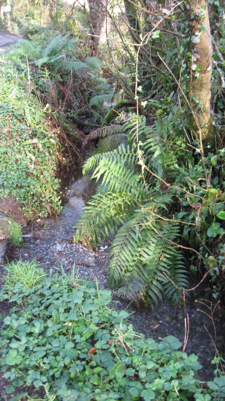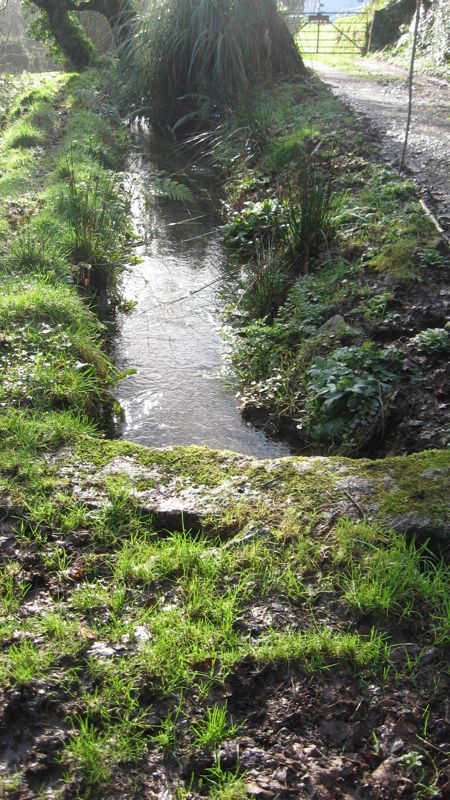 Leat crossing lane on hill to Trannack by Anvowher or Lower Trannack Farm. There is a slight optical illusion here as the water can appear to be going uphill!