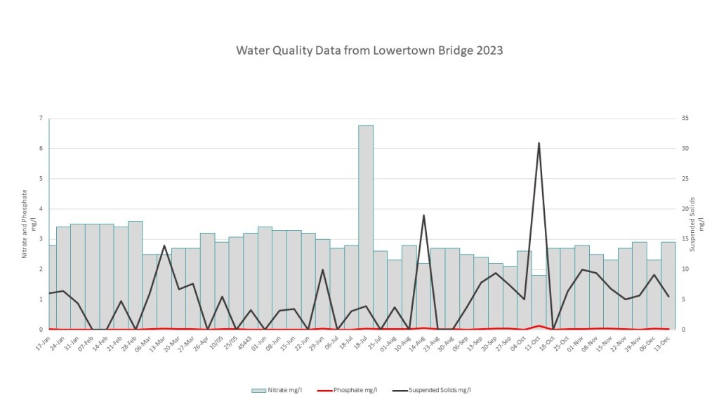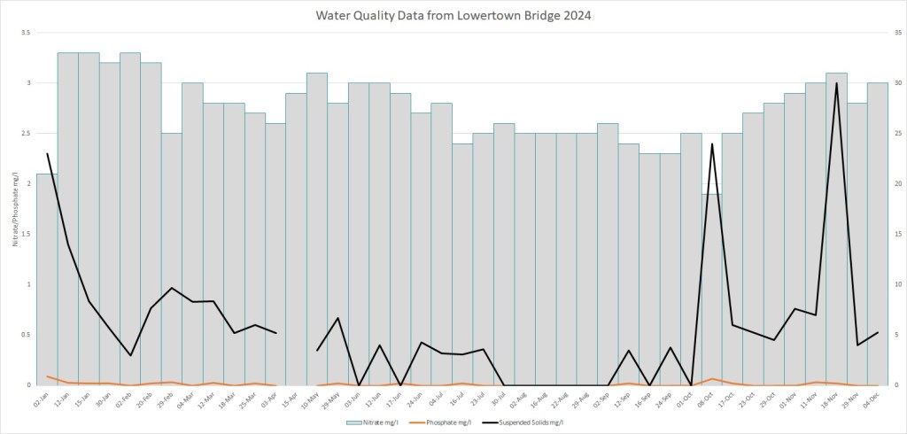 The chart above shows the data for 2023. Throughout the year nitrate and phosphate levels were well within the required standards showing we have a healthy river from an environmental viewpoint. This trend has continued throughout 2024 as indicatd in the chart below. It is interesting to note that phosphate levels increase marginally when there is a sharp increase in suspended solids. This suggests the primary source of phosphate is water run-off from agricultural land.